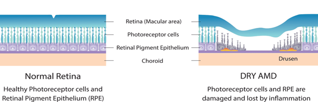 Dry AMD is the most common form of this eye disease. It develops slowly over time as the macula becomes thinner and small protein deposits, called drusen, build up.